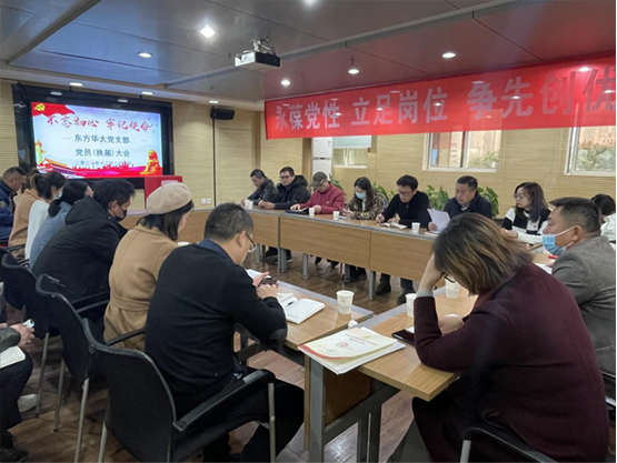 2021 年 12 月 24 日,東方華太黨支部黨員(換屆)大會暨 12 月份支部主題黨日集體學習會議在公司 309 會議室順利召開。大會主題為“永葆黨性、立足崗位、爭先創(chuàng)優(yōu)”上級黨工委江漢二橋街道黨工委指派黨建指導員一行兩人和公司總經(jīng)理蒞臨到會指導。